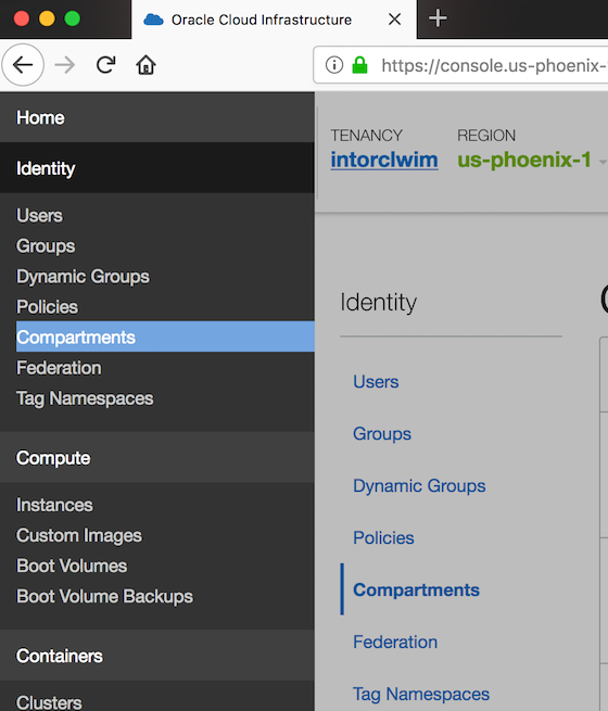 To test the CLI, you’ll need the Compartment OCID. You can find this via the Console main “hamburger” menu Identity > Compartments. See figure 2.