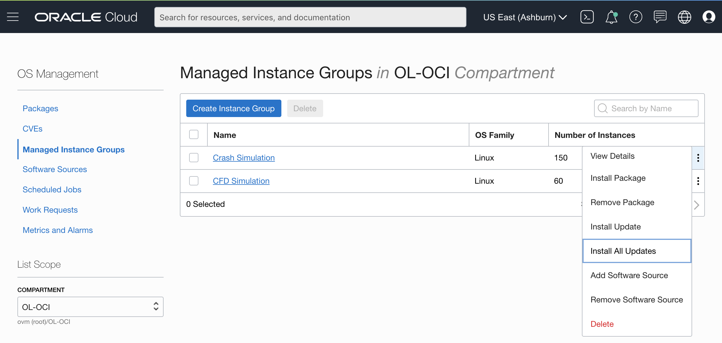 The third solution to help simplify patch management is the Oracle Cloud Infrastructure OS Management service. It provides an easy-to-use interface within Oracle Cloud Infrastructure that enables you to perform fleet management of Oracle Linux HPC instances. It allows you to monitor the packages installed on instances, search for and add or remove packages, and schedule updates for groups of instances. Automated patch management with the OS Management service helps reduce complexity, risks, human errors, and operational costs.
