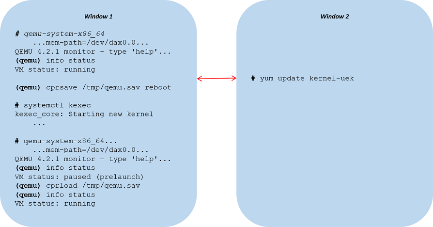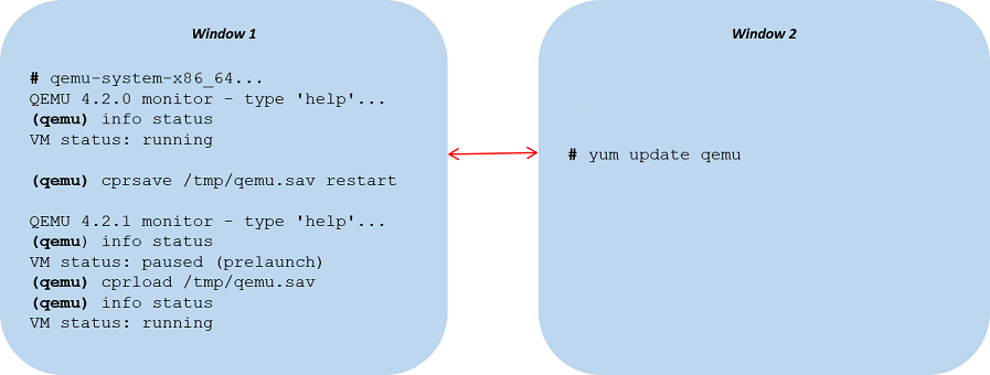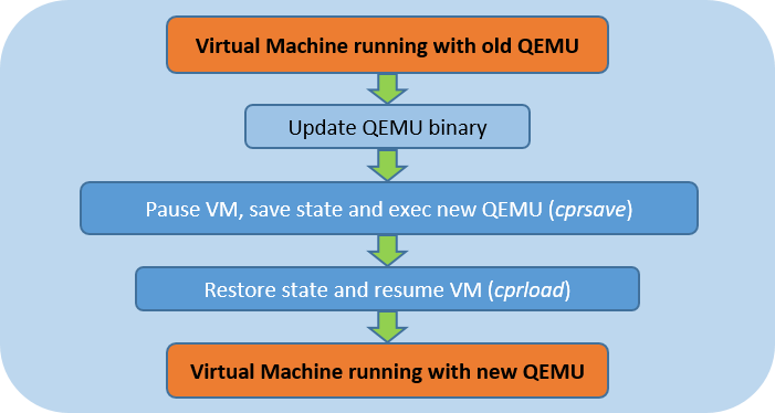Many critical fixes can be applied by updating only QEMU, or by ksplice‘ing the host kernel and its kvm module. However, if you need to completely update the host kernel, we provide a method for doing so, using cprsave with the reboot mode argument. In this mode, cprsave saves state to a file and exits. You then kexec boot a new kernel and issue cprload. The guest RAM must be backed by a persistent shared memory file, such as device DAX or a /dev/shm file that is preserved across kexec via Anthony Yznaga’s proposed PKRAM kernel patches.