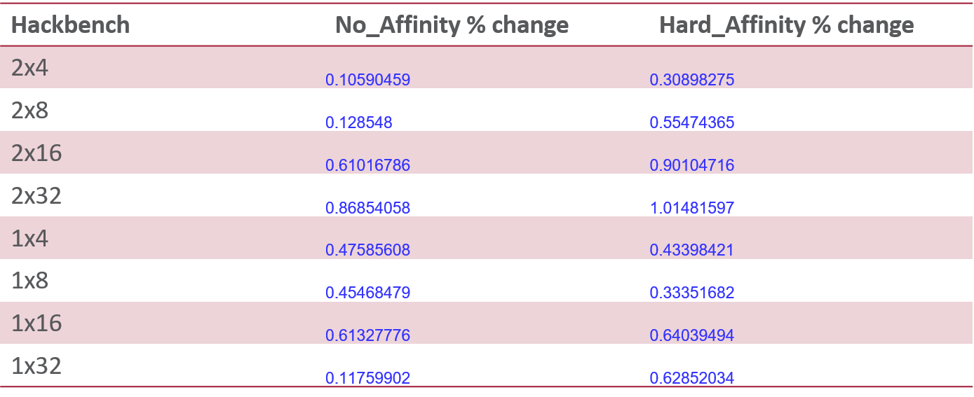 With such an implementation, experiments were run with 2 instances of Hackbench and then 2 instances of DB by soft affinitizing each instance to one NUMA node on a 2-socket system. Another set of runs were done with only 1 instance active but still soft affinitized to the corresponding node. The load in each instance of Hackbench or DB was varied by varying the number of groups and number of users respectively. The following graphs outline the performance gain (or regression) for hard affinity and soft affinity with respect to no affinity. Hackbench shows little improvement for hard or soft affinity (possibly due to less data sharing) while the DB shows substantial improvement for the 2 instance case. For 1 instance, Hackbench shows significant regression while DB achieves performance very close to no affinity. The DB seems to achieve best of both worlds with such a basic implementation: improvement like hard affinity and almost no regression like no affinity.