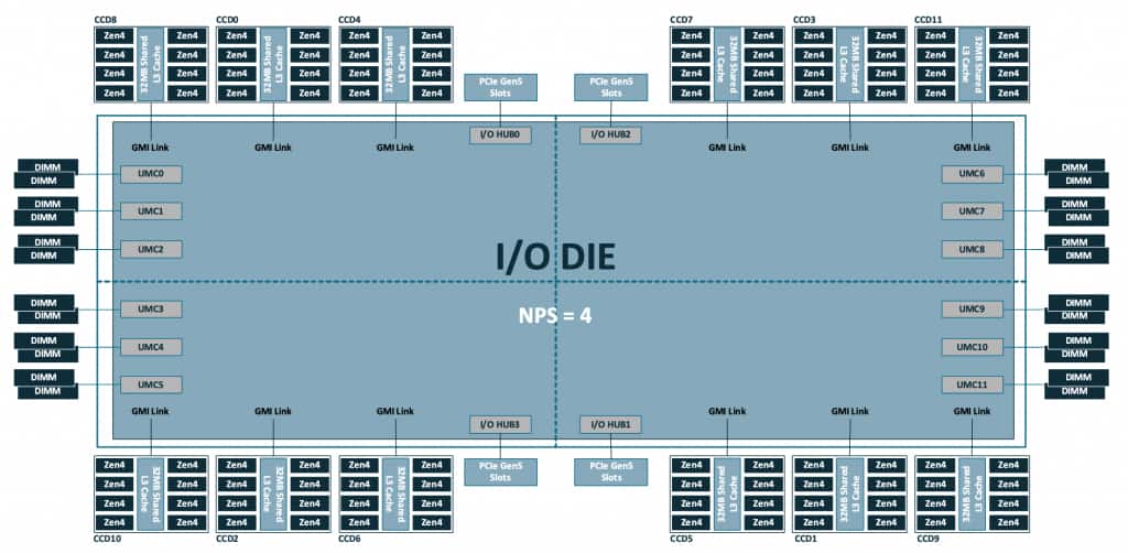 Note the 12 CCD are distributed on quadrants of the I/O die, which also holds other local resources like memory channels and PCIe lanes. In a standard configuration with NPS=1, all these resources are configured as a single NUMA node.