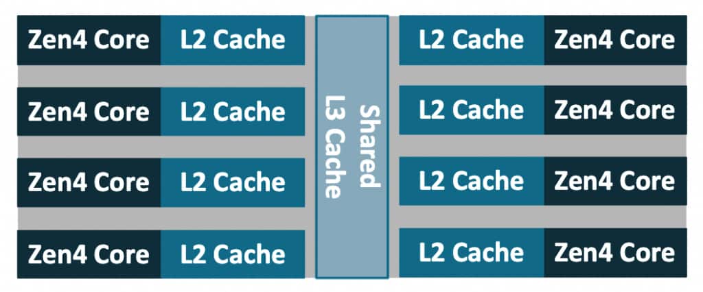 A GenoaCCX, showing 8 compute cores sharing an L3 cache: