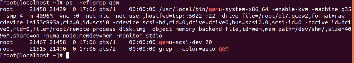 /usr/local/bin/qemu-system-x86_64 -name vm -m 6G -drive file=/root/ol7.qcow2,format=raw -enable-kvm -machine q35,accel=kvm -rdevice lsi53c895a,rid=0,id=scsi0,command=qemu-scsi-dev -rdevice scsi-hd,rid=0,drive=drive0,bus=scsi0.0,scsi-id=0 -rdrive id=drive0,rid=0,file=/root/cirros-0.4.0-x86_64-disk.img,format=qcow2 -object memory-backend-file,id=mem,mem-path=/dev/shm/,size=6G,share=on -numa node,memdev=mem -display none -vnc :0 -monitor stdio -device e1000,netdev=net0 -netdev user,id=net0,hostfwd=tcp::5555-:22