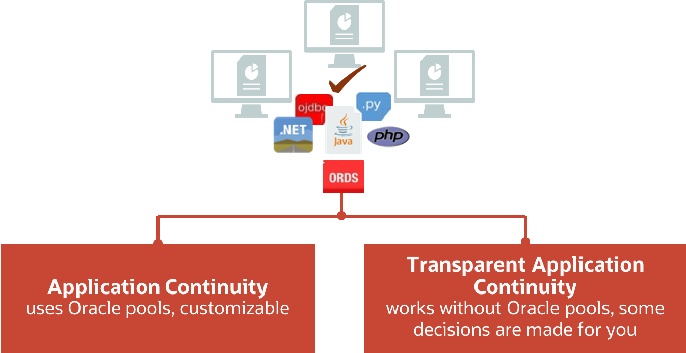 Application Continuity enables workload processing continuity during disruptions at the database tier. It works with established applications or those newly deployed, providing protection for a broad range of commonly used application stacks. It does so while guaranteeing the integrity of the transactions, data and results returned to the user. And all without application changes.