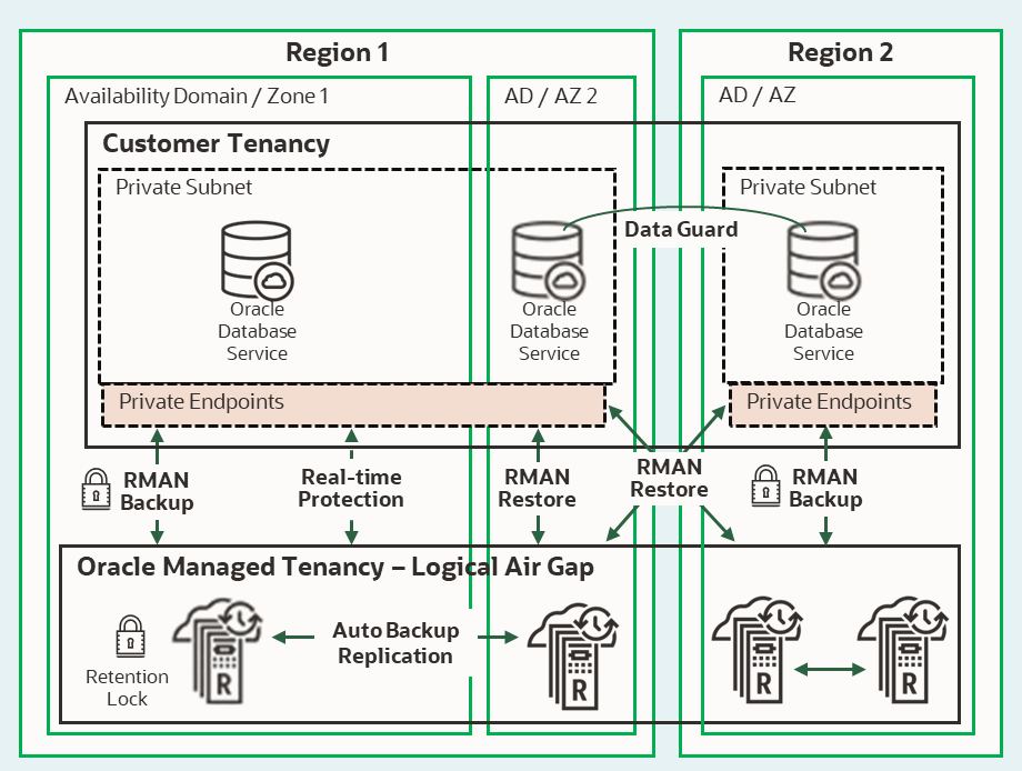 - ZRCV is located in an Oracle-managed tenancy, fully isolated from customer access tenancy. Customers are only allowed to use RMAN to send backups and request restores via a Private Endpoint. In addition to it: