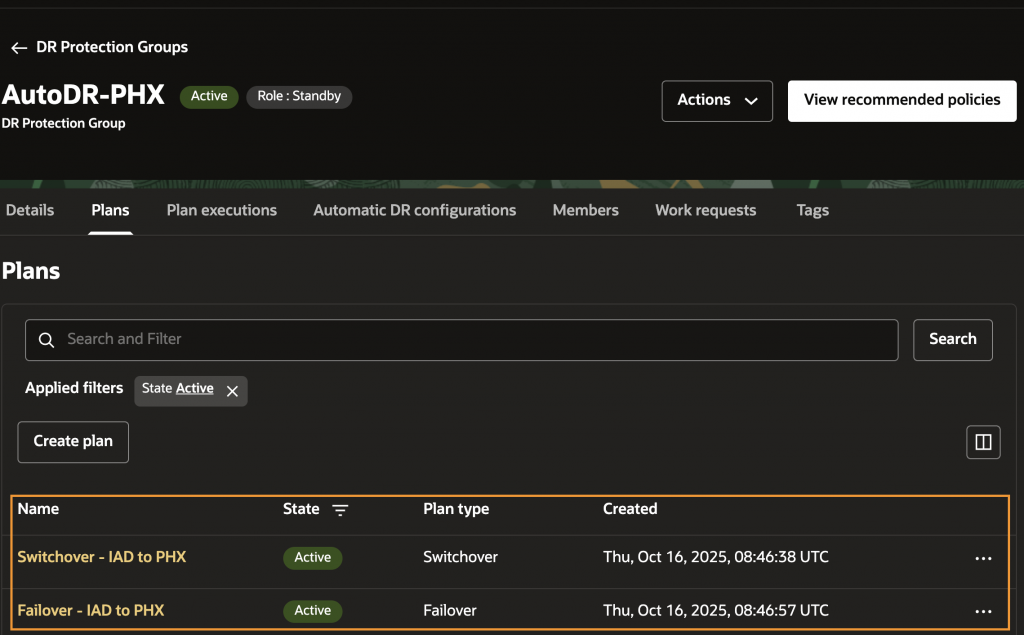 1. Switchover and Failover DR plans are created in the AutoDR-PHX DR protection group.