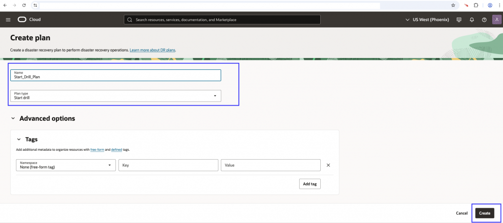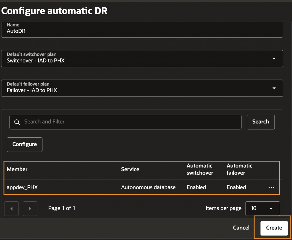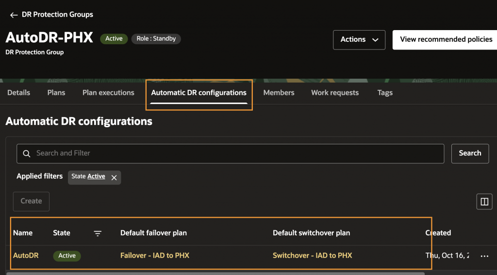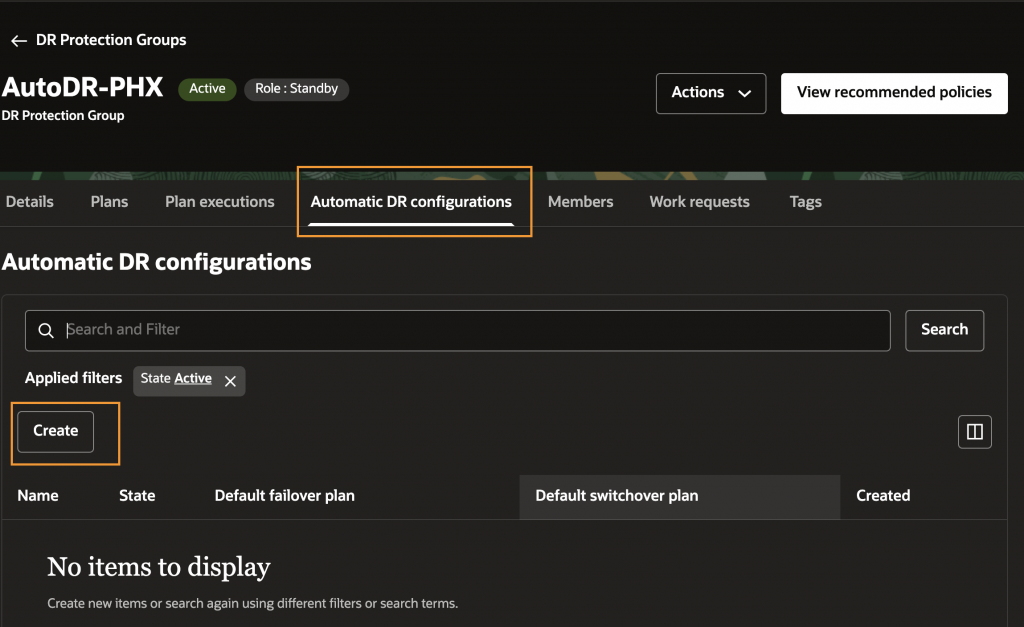 5. Verify the Automatic DR member is added and the DR plans are enabled. After that, click “Create”.