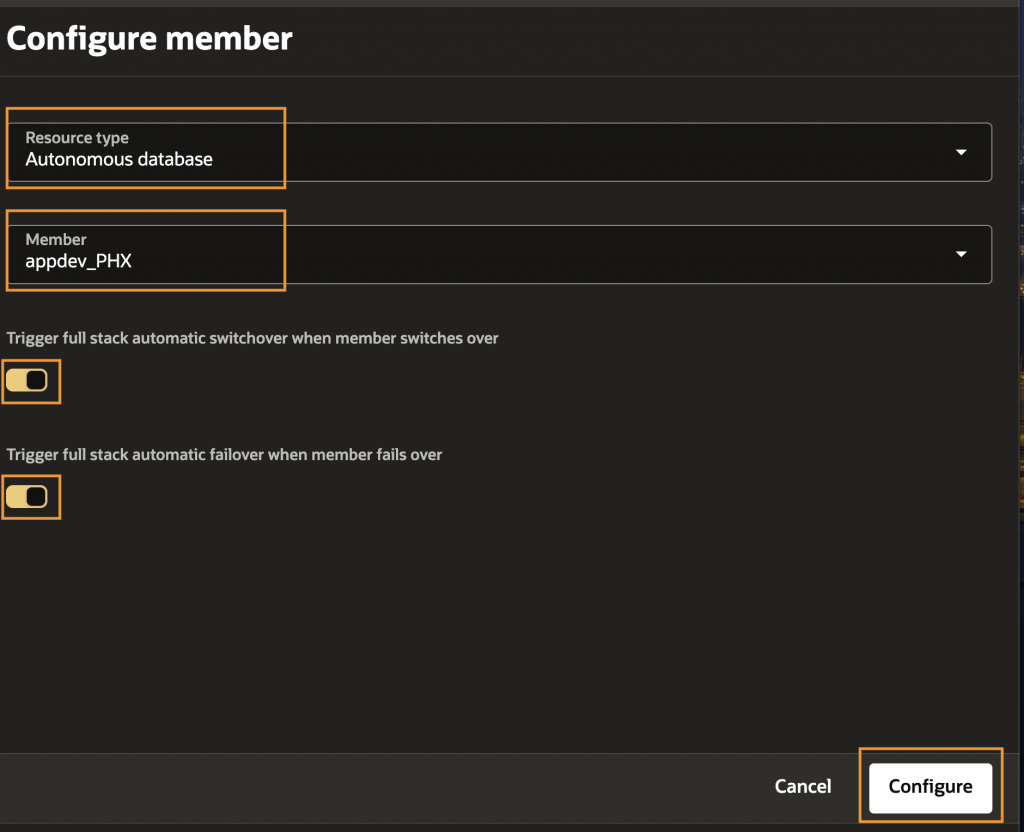 4. Click Configure and select the supported resource type. In our example, we will select “Autonomous database”, select the required autonomous database which is added as a member that you want to add to the Automatic DR configuration. If you would like to activate both the switchover and failover plans, toggle both buttons to trigger the automatic switchover and failover plans. Enabling one of these options is mandatory to use the Automatic DR configuration.