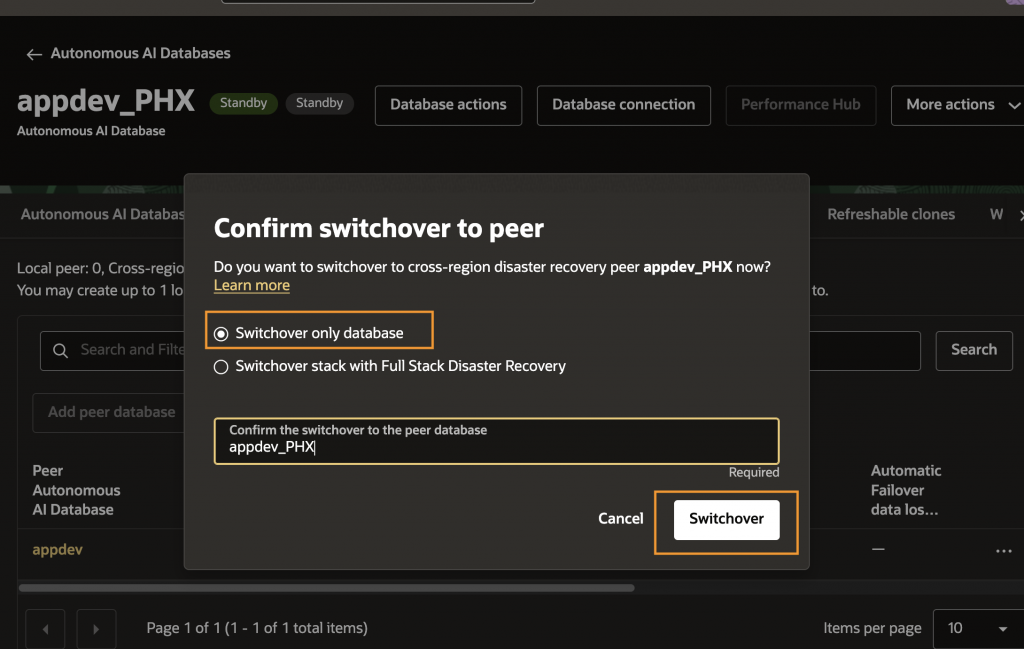 7. To test this AutoDR, let’s perform the Database switchover of the Autonomous Database from the Autonomous AI Database console.