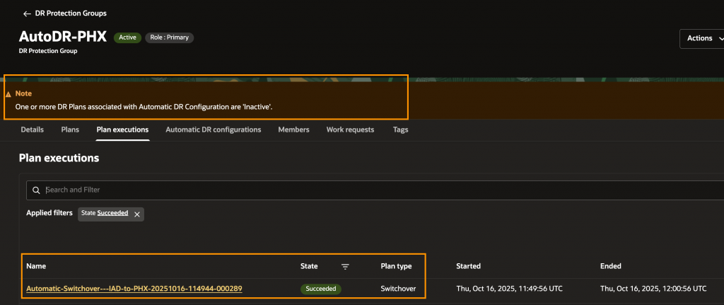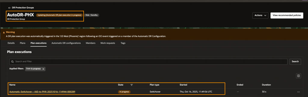 The new Automatic DR capability in OCI Full Stack DR eliminates this manual step by introducing event-driven automation. When an Oracle database switchover or failover occurs, Full Stack DR can automatically execute the corresponding DR plan associated with that DR Protection Group, ensuring a seamless transition across the full application stack.