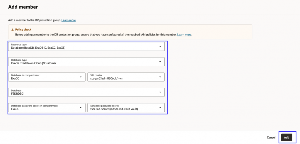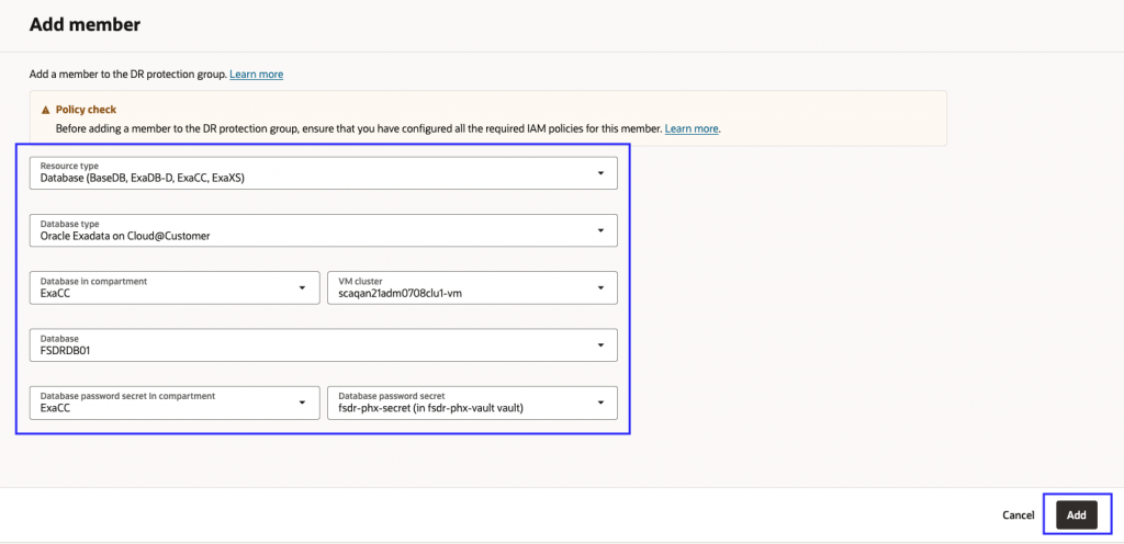- Supported Oracle database members: Automatic DR configuration currently supports the following Oracle database types: ADB-S, ADB-D, ExaDB-D, ExaDB-XS, and ExaDB-C@C. These database resources must be added to the DR Protection Group before enabling Automatic DR. Oracle Data Guard must be configured using OCI console/APIs/SDKs.