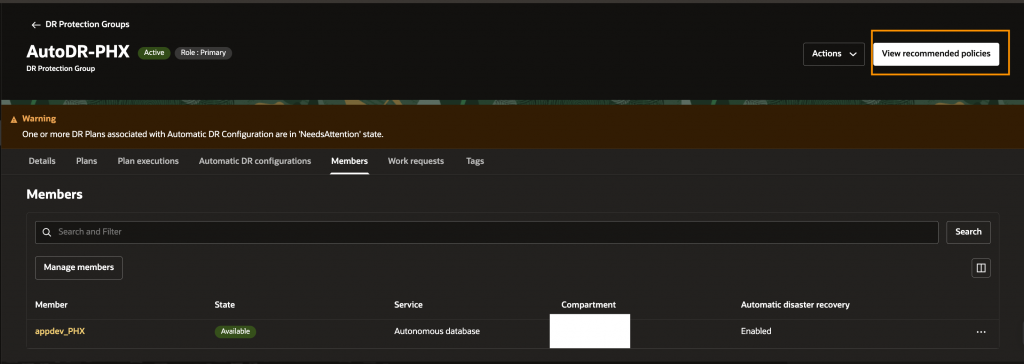 Consider a DR Protection Group pair that includes an Autonomous Database as one of its members. Within the DR Protection Group details page, you’ll now see a new section labelled “View recommended Policies.”