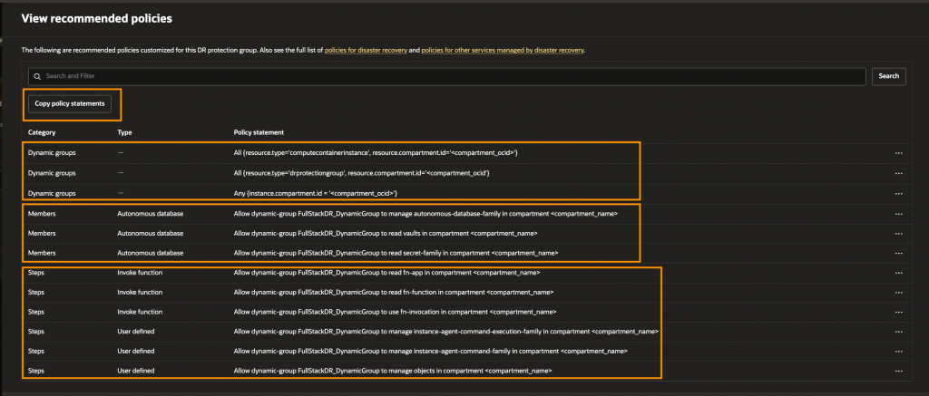 When you select this option, Full Stack DR automatically analyses the group’s members and displays the required IAM policies and Dynamic Group configurations specific to those resources. You can then use the “Copy policy Statements” button to copy the recommended commands, review them for alignment with your governance requirements, and create or update the corresponding IAM policies and dynamic groups in your tenancy. For more details, refer to the Full Stack DR Resource Principals documentation.