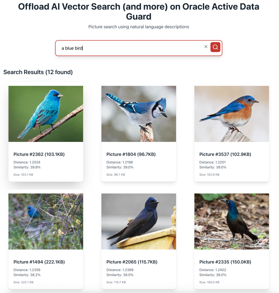 VECTOR_EMBEDDING(cliptxt USING 'a blue bird' AS data)encodes the search query into the same space as the image embeddings.VECTOR_DISTANCEfinds images with the closest semantic match.