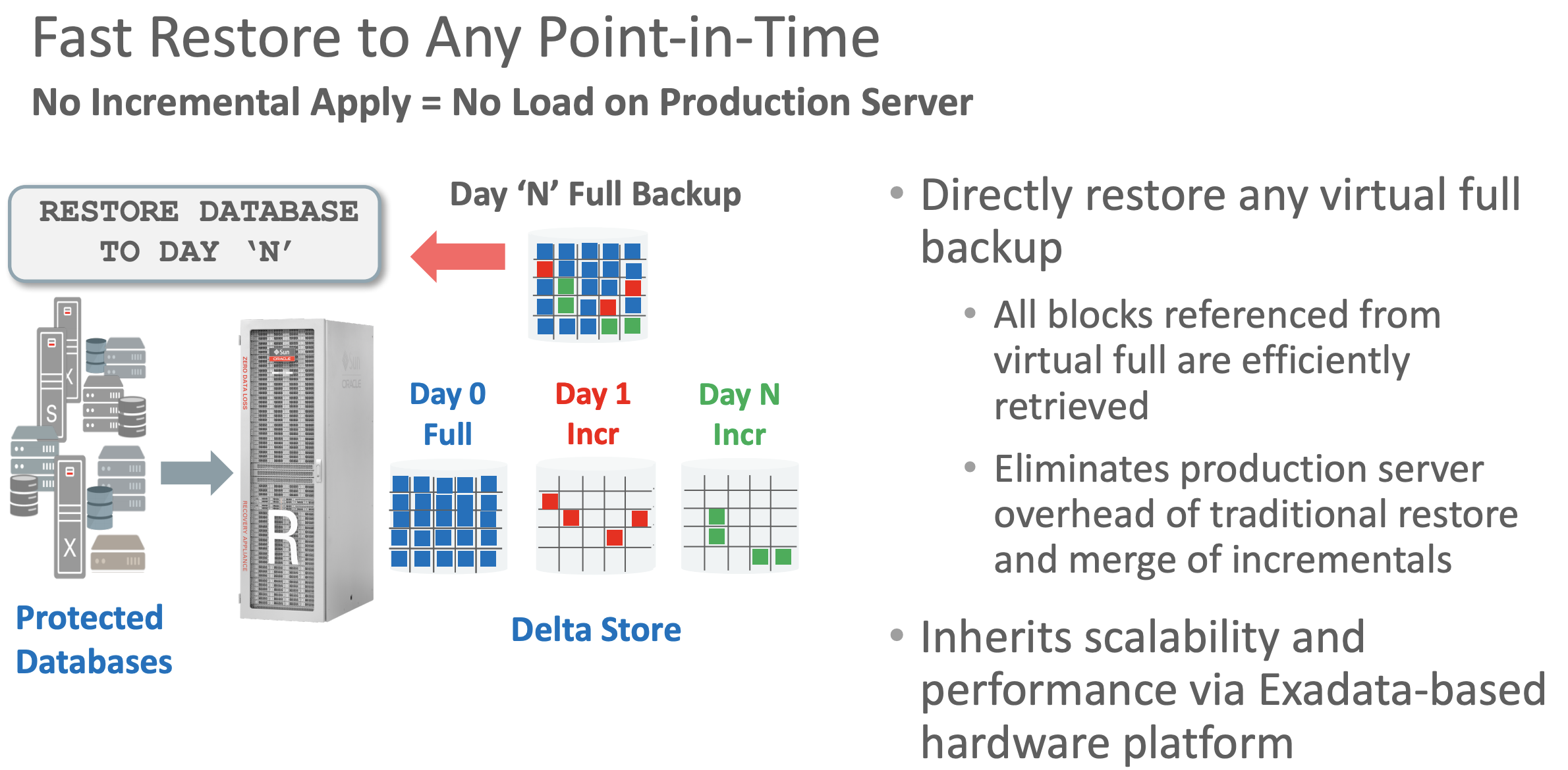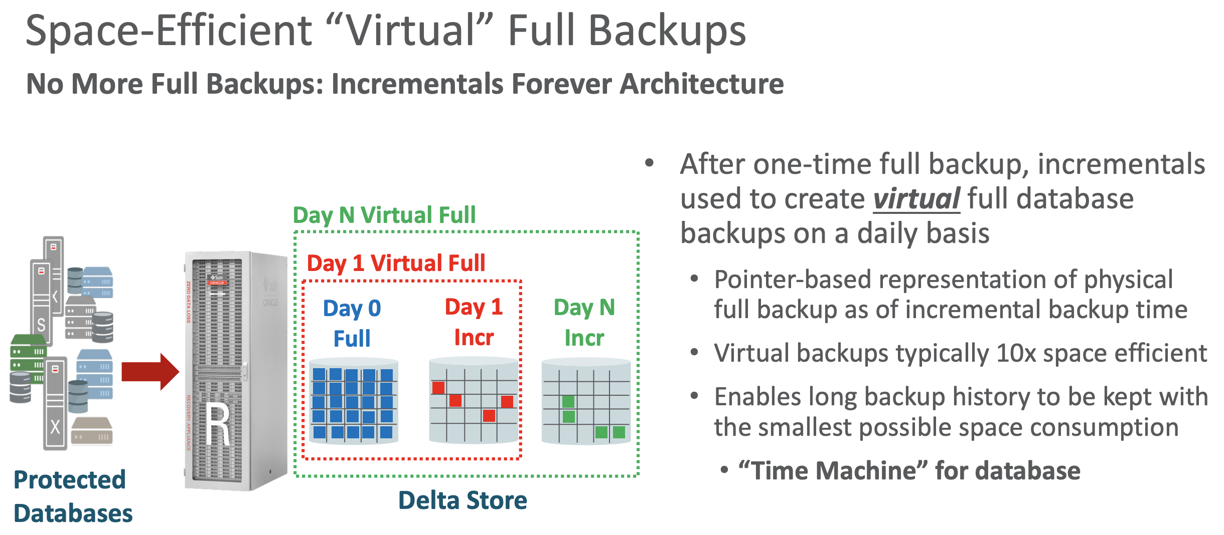 - Virtual full restores eliminate the need to restore and apply incremental backups, as with traditional backup storage. The virtual full references all needed data file backup blocks and directly creates the needed physical full backups requested by RMAN restore. This reduces the overall migration window, and again, is especially key for large database environments.