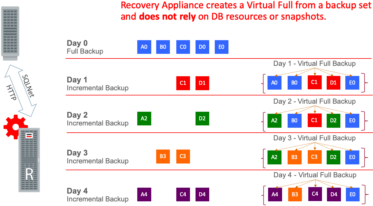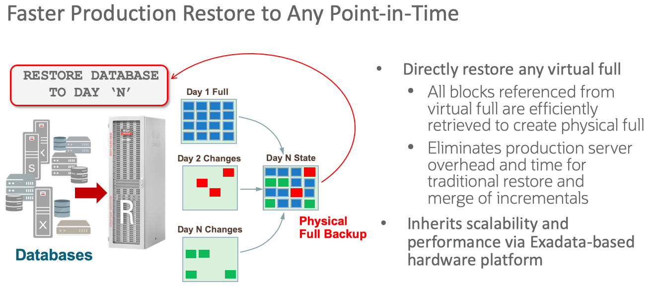 Contrast this with Recovery Appliance, which offers true incremental forever and virtual full technology, where recoveries can be performed to any point-in-time with just the familiar RMAN ‘restore’ and ‘recover’ commands. This innovative approach also eliminates the daily incremental merge operation and resource overhead, freeing production databases to handle more critical business workloads.