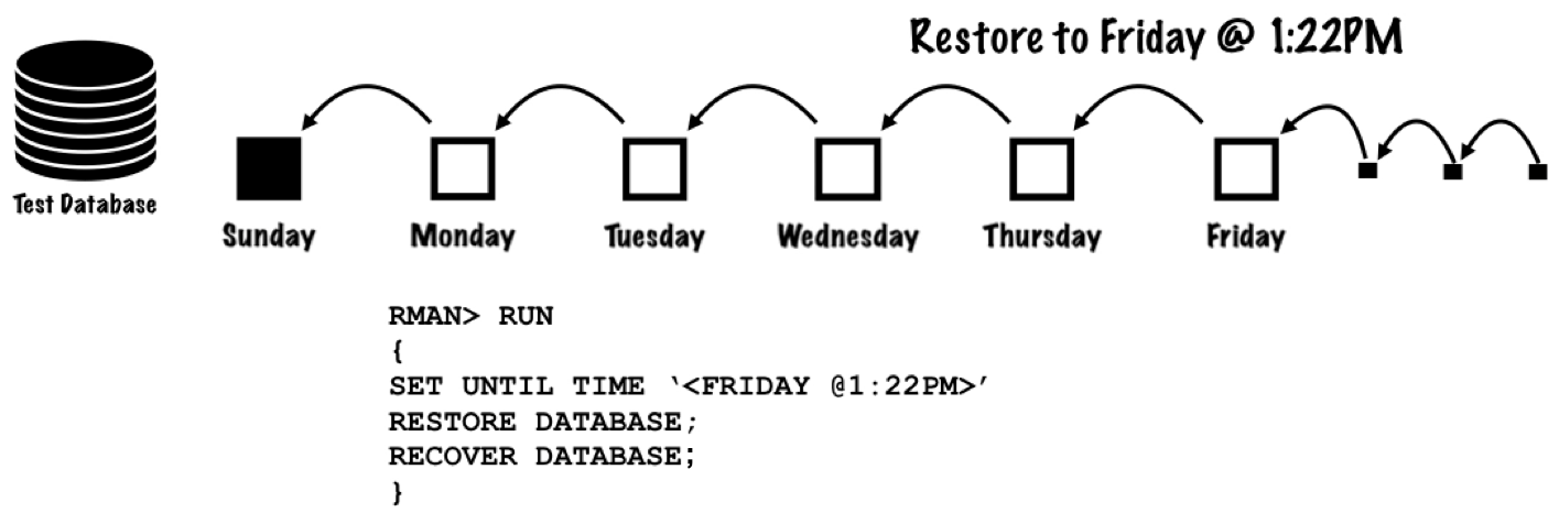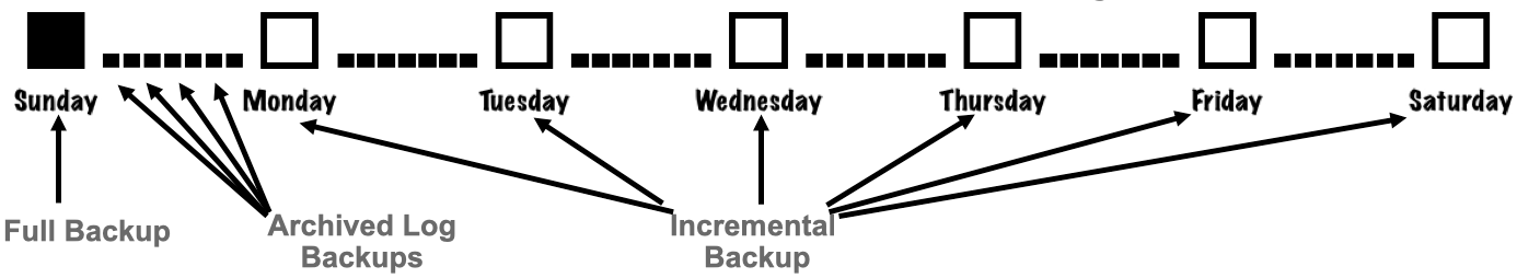 For example below, a full backup is taken on Sunday followed by incremental backups on Monday through Saturday, with archived log backups taken throughout the week: