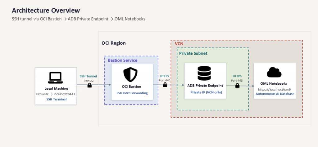 To get started, refer to this technical guide that walks through the complete setup, from configuring network security rules and creating the OCI Bastion service and session, to establishing the SSH tunnel from your local machine and opening OML Notebooks in your browser.