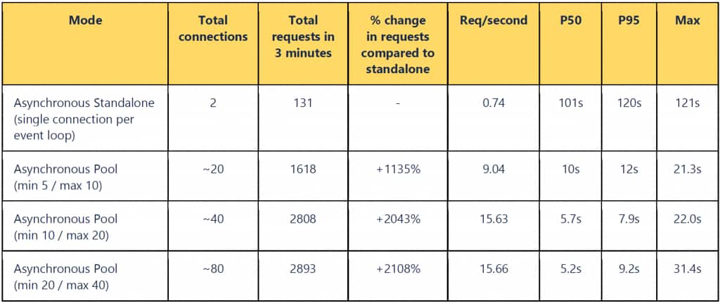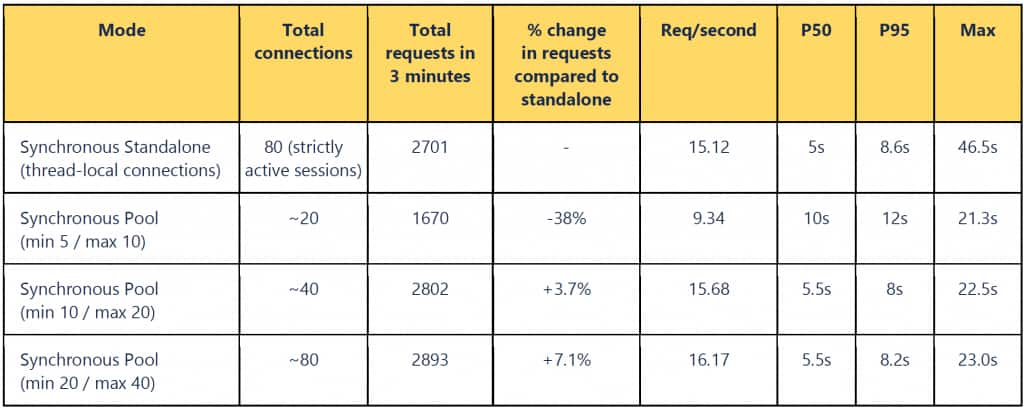 - We achieved 3.7% more requests than the synchronous standalone test, but with half the number of open connections. In contrast, 80 active connections (the line below) is underutilizing the connection pool. A shared connection pool of size 20 across 40 workers gives optimal performance with both workers and pools being fully utilized.