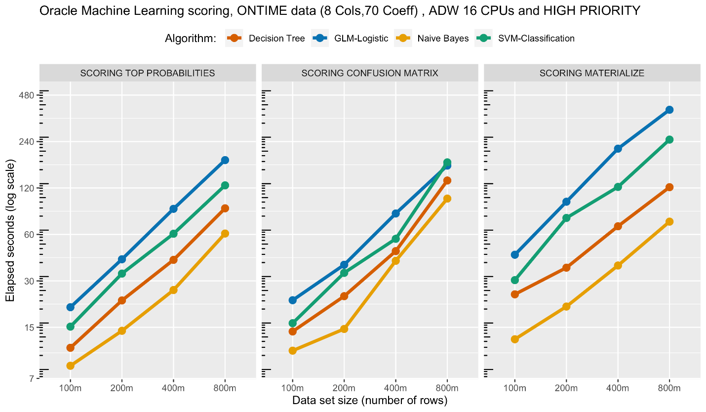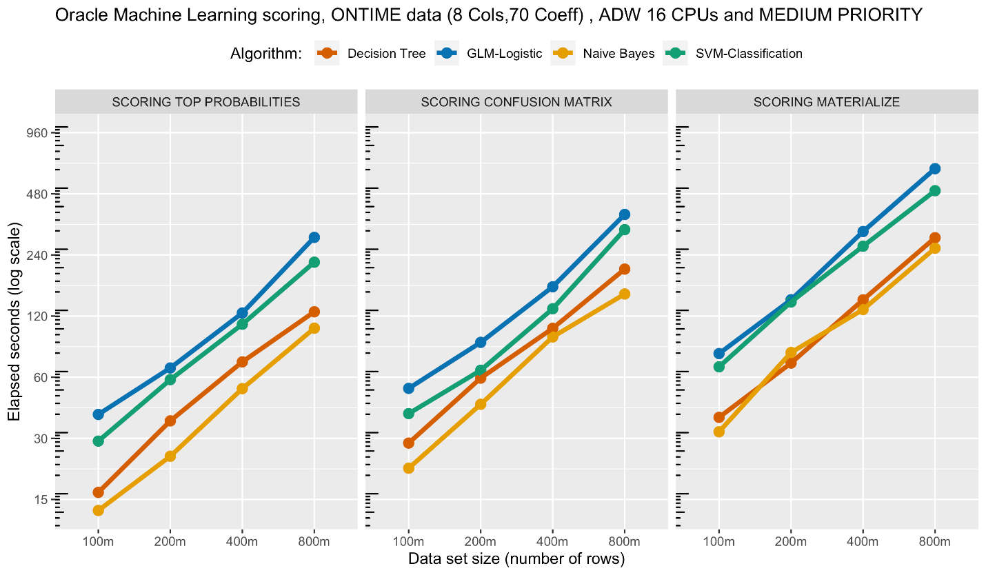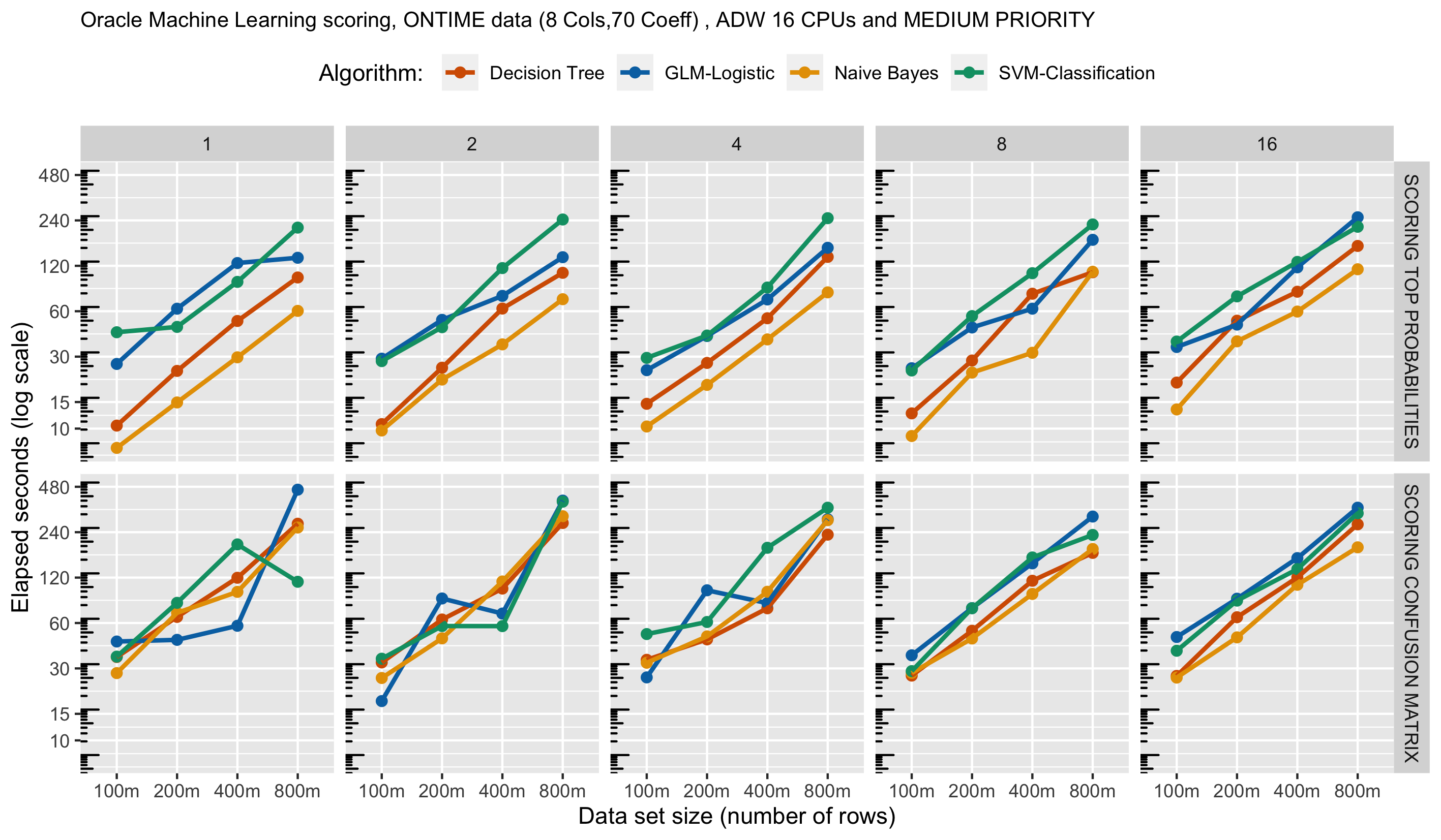 One of the benefits of batch scoring is that it is one of those embarrassingly parallel problems— data can be easily partitioned and scored in parallel since one record’s score is independent of another’s. With Oracle Machine Learning in-database algorithms, parallel scoring is built in, meaning the user doesn’t need to do any extra coding. This is in contrast to various other products and open source packages that have single-threaded implementations where the user is responsible for coding parallel behavior. As such, algorithm implementationscoring algorithm implementation—is also important.
