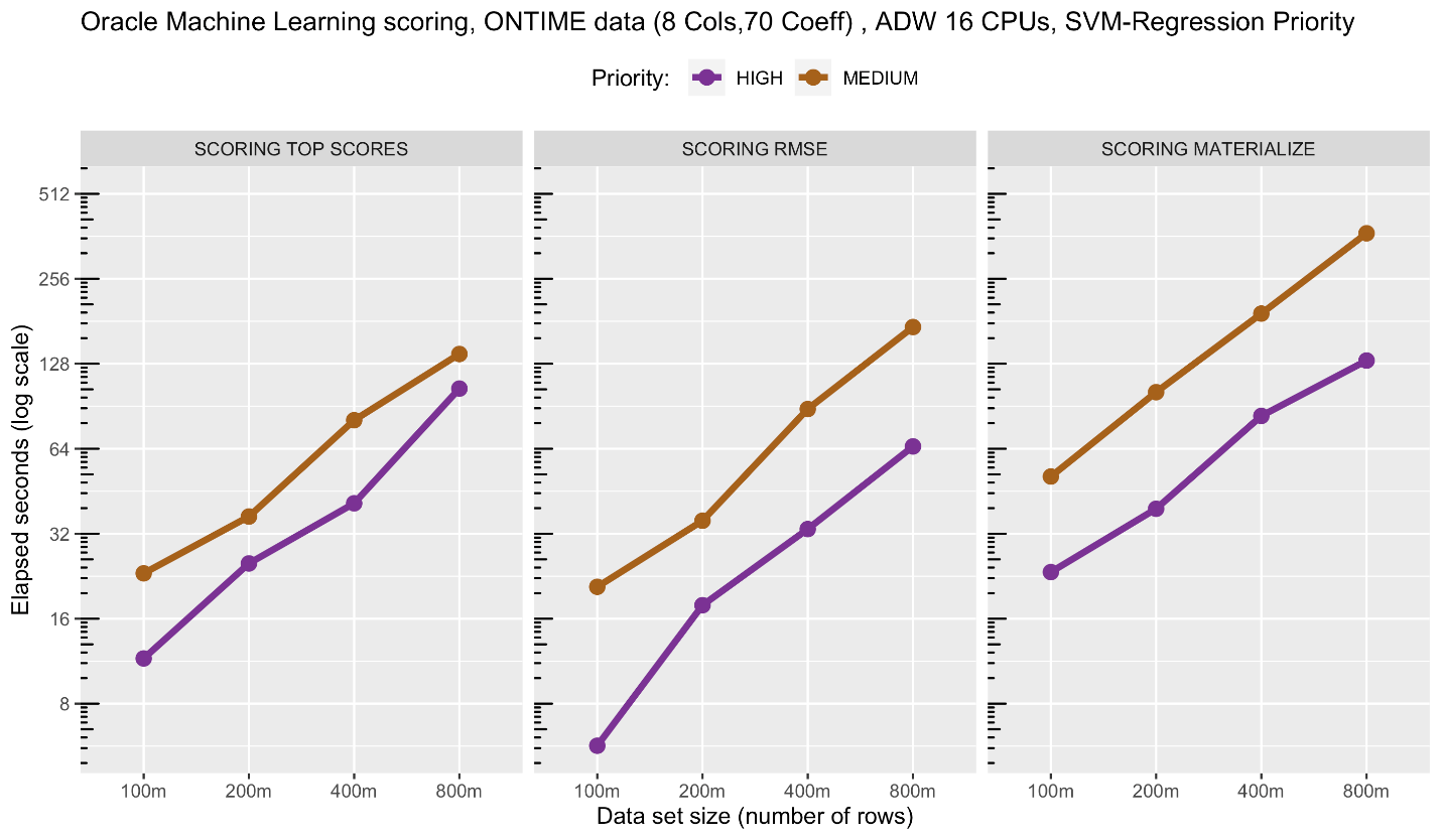 In the following figure, we compare directly the scoring performance for SVM regression using HIGH and MEDIUM priority. Again, we see essentially linear scalability, speed of row set computations, and the benefits of HIGH over MEDIUM priority.