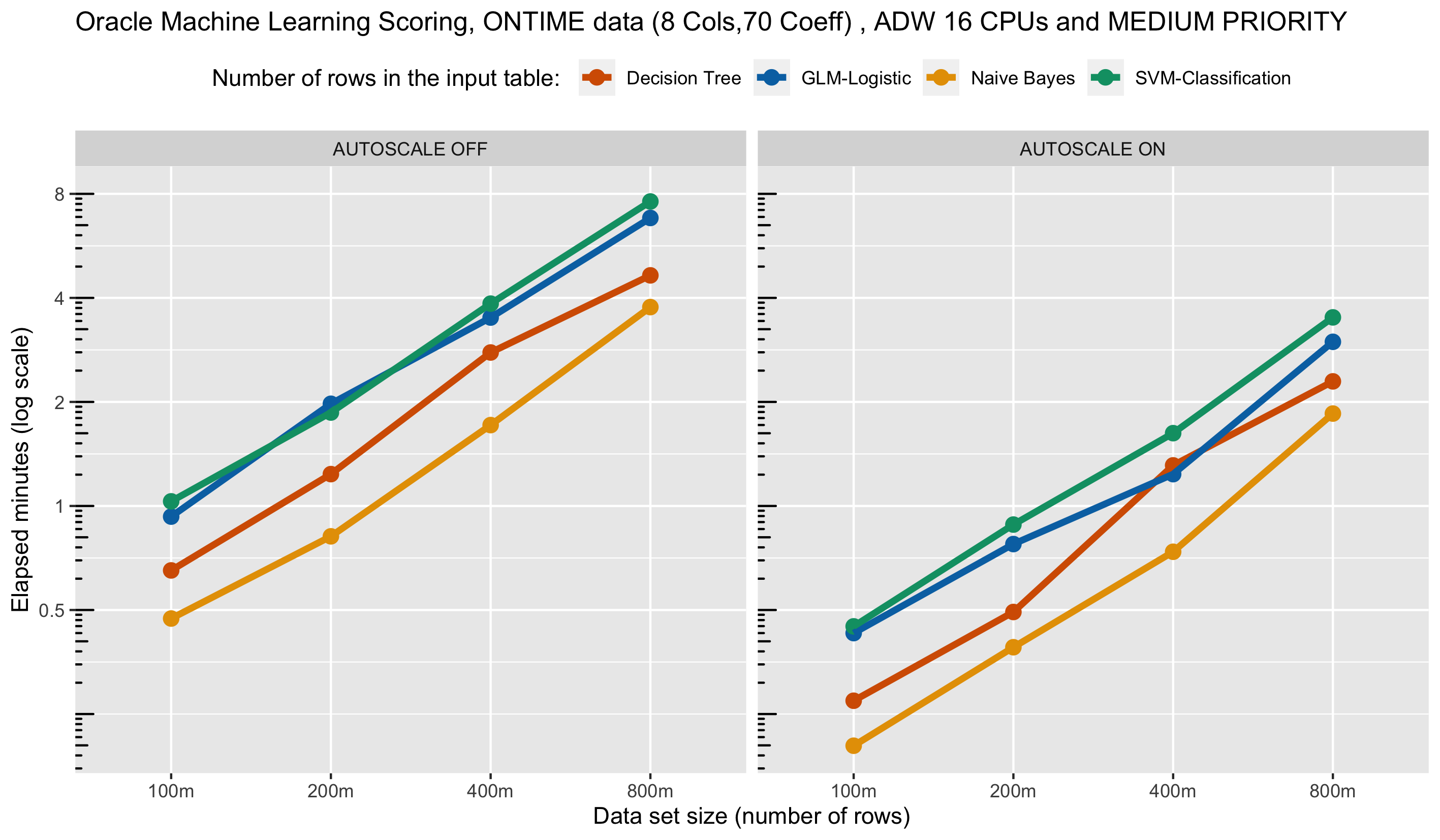 To illustrate how Oracle Autonomous Database with Oracle Machine Learning performs, we conducted tests on a 16 CPU environment, involving a range of data sizes, algorithms, parallelism, and concurrent users. Oracle Autonomous Database supports three service levels: high, medium, and low. ‘High’ significantly limits the number of concurrent jobs, each of which can use up to the number of CPUs allocated to database instance (here, up to 16 CPUs). ‘Medium’ allows more concurrent users but limits the number of CPUs each job can consume (here, 4CPUs). ‘Low’ allows even more concurrent use but only single-threaded processing, i.e., no parallelism.