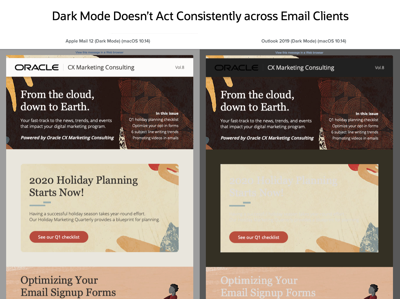 You can see the differences in how Apple Mail 12 and Outlook 19 implement dark mode affected the Oracle Digital Experience Agency newsletter below. Whereas Apple Mail’s dark mode affects only the app’s interface (in this case), Outlook’s dark mode affects the email pretty dramatically, making portions of it hard or impossible to read—at least prior to us implementing some fixes that we’ll discuss later.