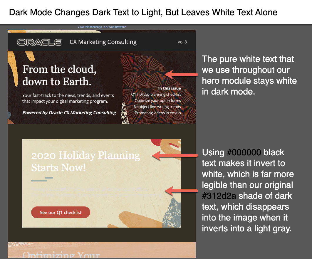 You can see how this can play out in our Oracle CX Marketing newsletter below. In the hero module, the white text that we use is unaffected by dark mode, staying white. However, in the second module, the headline that is in #000000 black is inverted to pure white and while the copy under it is inverted from #312d2a to a light gray that becomes unreadable in this case.