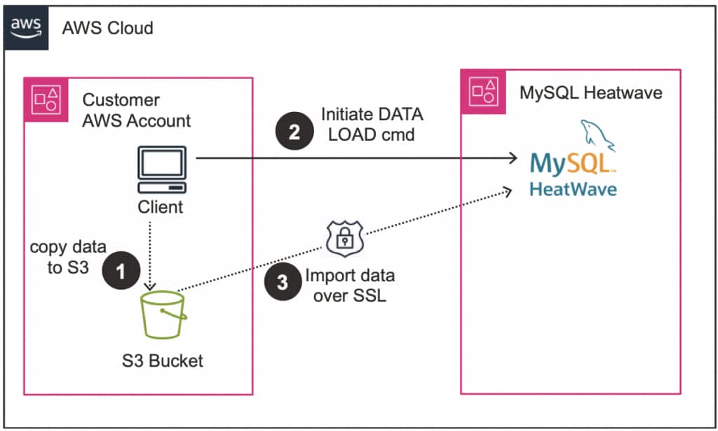 MySQL HeatWave on AWSでは、クライアントからMySQLのテーブルにデータをインポートするためのMySQLネイティブデータインポート機能(LOAD DATA 文)を提供しています。これは、MySQL HeatWave に少量のデータセットのみをインポートしたい場合に便利です。しかし、AWS 上でアプリケーションやワークロードを実行しているお客様の中には、データを Amazon S3 に保存しており、データセットが大規模になることがよくあります。