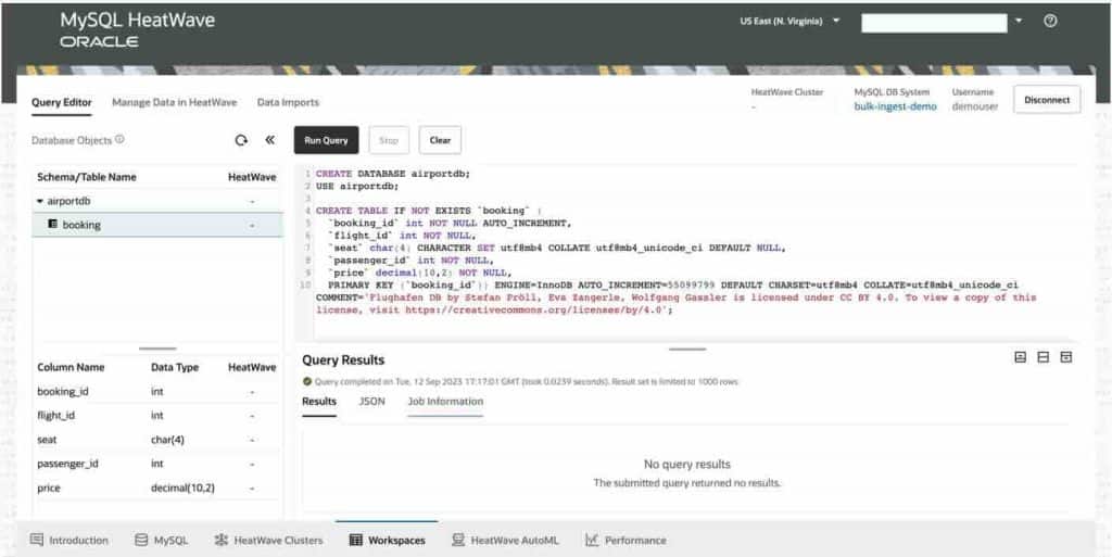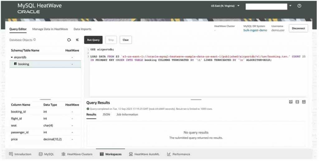 • LOAD DATA FROM S3 ‘s3-us-east-1://oracle-mysql-heatwave-sample-data-us-east-1/published/airportdb/v1/tsv/booking.tsv.’ COUNT 25 IN PRIMARY KEY ORDER INTO TABLE booking COLUMNS TERMINATED BY ‘\t’ LINES TERMINATED BY ‘\n’ ALGORITHM=BULK;