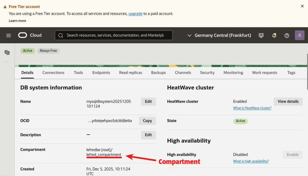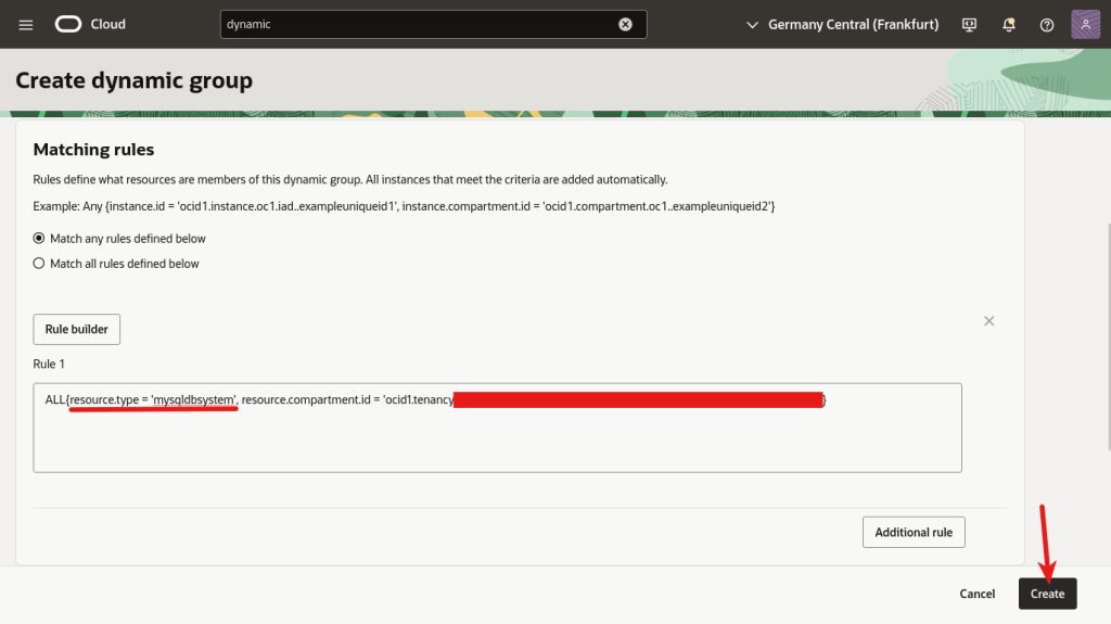 If the DB System was not part of a specific compartment but directly deployed in the tenancy, we could remove the “,resource.compartment.id= ‘ocid1.tenancy….” part.