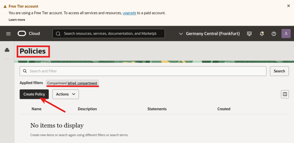 And if we have our DB System running in a compartment, the three policies are in compartment ‘name of it’. Otherwise, if the DB System was running in the root compartment of the tenancy, the rules should have been in tenancy.