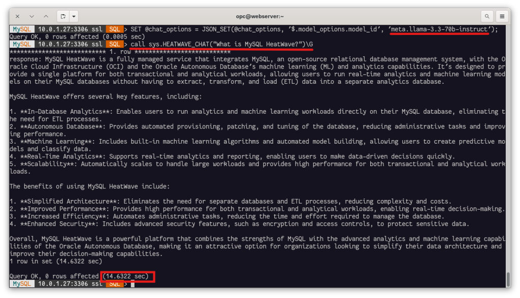 Now we can specify a model from the OCI Generative AI Service and call the procedure sys.HEATWAVE_CHAT() directly from our database connection: