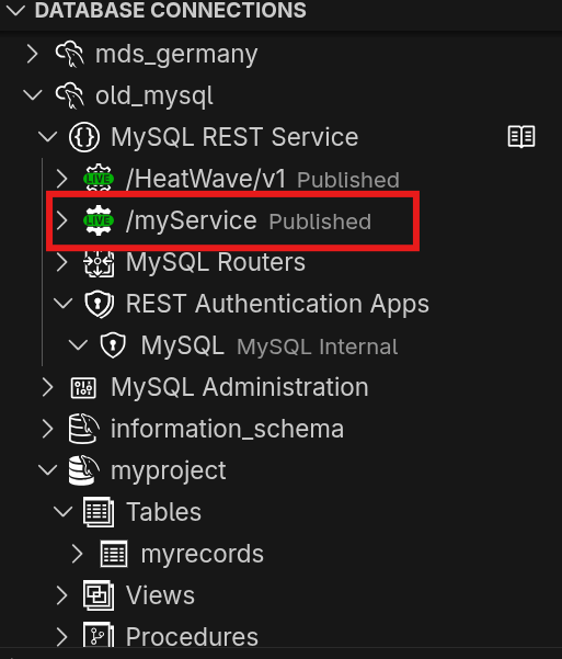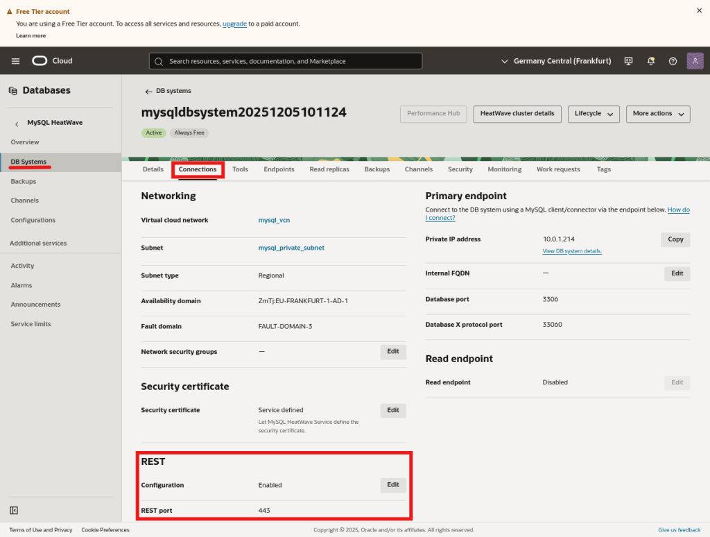 The starter kit deploys a MySQL HeatWave DB System on OCI (see previous posts [1],[2],[3],[4],[5],[6],[7]) and enables the MySQL REST Service automatically: