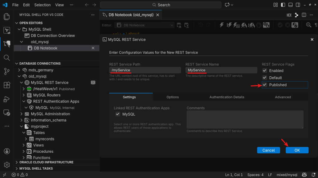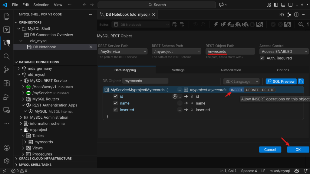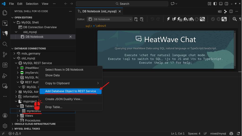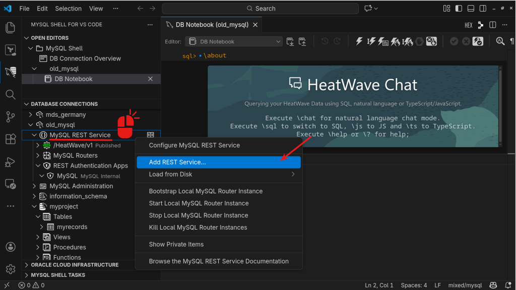 We will use MySQL Shell for Visual Studio Code to create a new table and provide access to it using MRS.