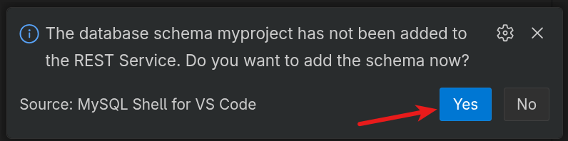 Since the schema hasn’t been added to the service (we used a shortcut), MySQL Shell asks whether we want to add it. We say “yes”:
