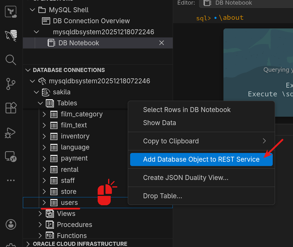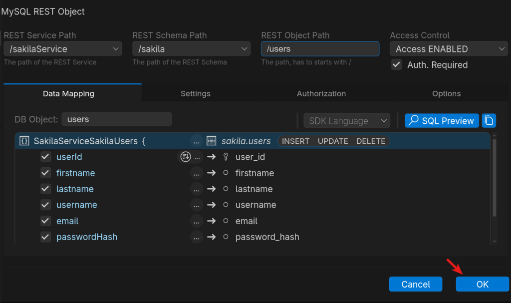 Now we need to add the Sakila schema to the REST Service (see part 8) and create a new table that will store our users’ credentials:
