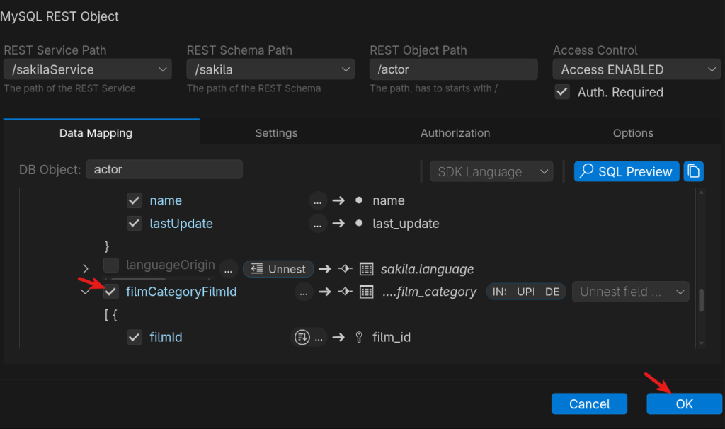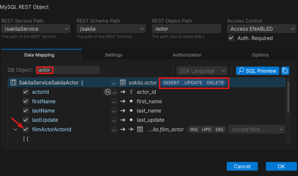 And for the actor table, we also allow DML (INSERT, UPDATE, DELETE), and we select several extra links to other tables, such as the films, the language, and the category: