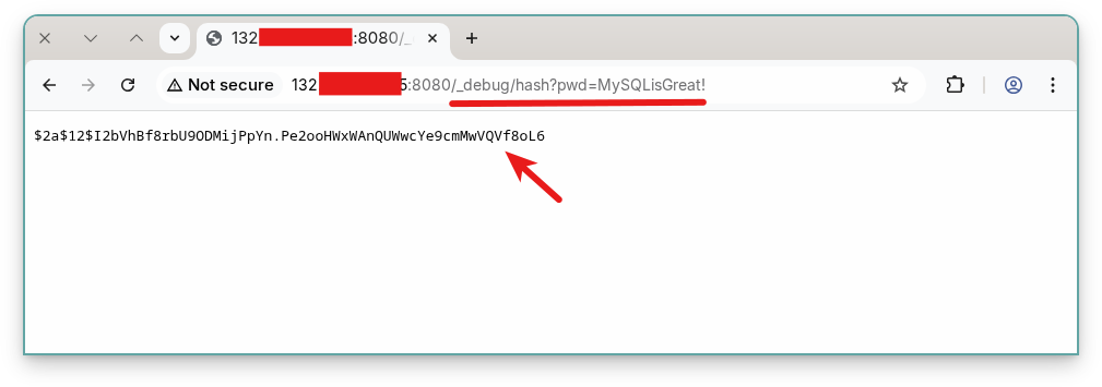 As you may remember, we created a user table to store our users; we still need to make one user. To know its hash password, we need to generate it. We have an endpoint that will generate such a hash: _debug/hash?pwd=<the password>: