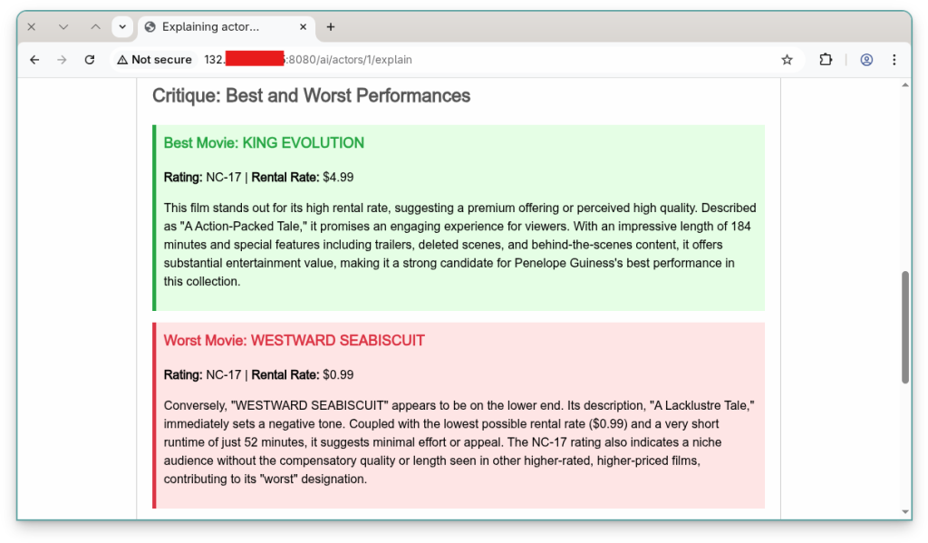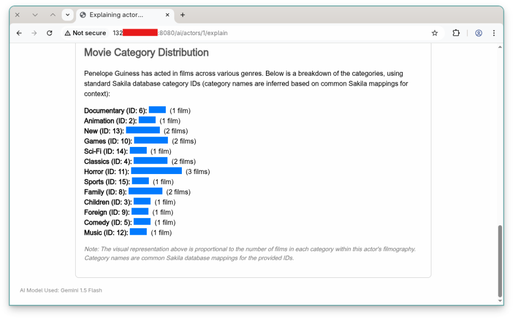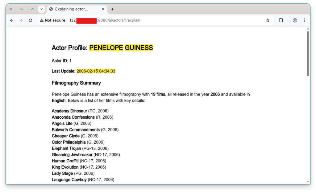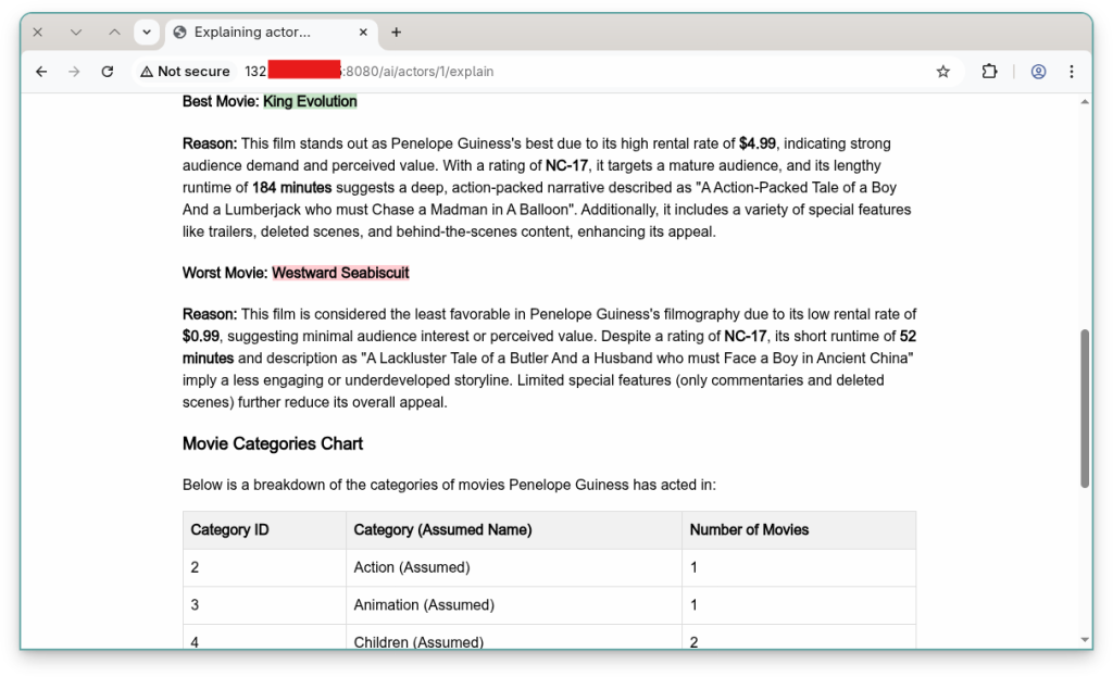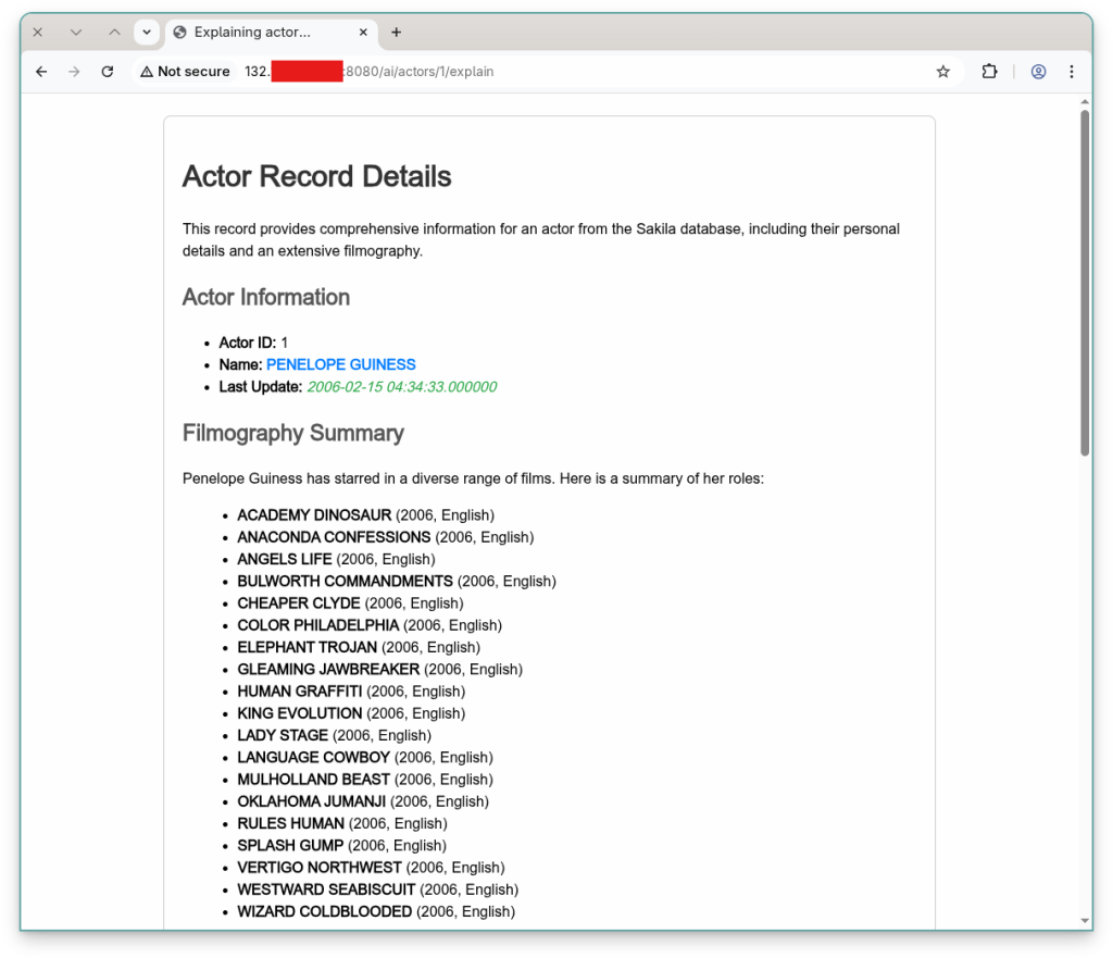 If we select the AI Summary for one actor, we will get a summary generated by the model we configured. The following example was generated using xai.grok-3: