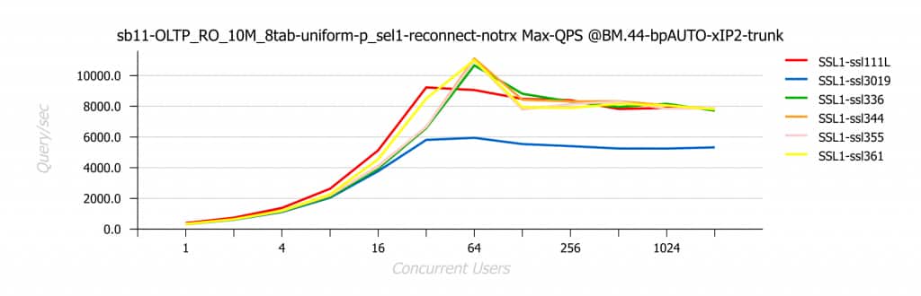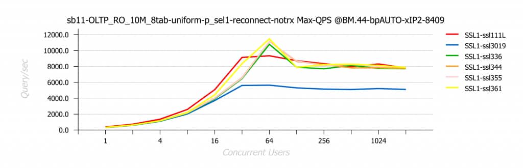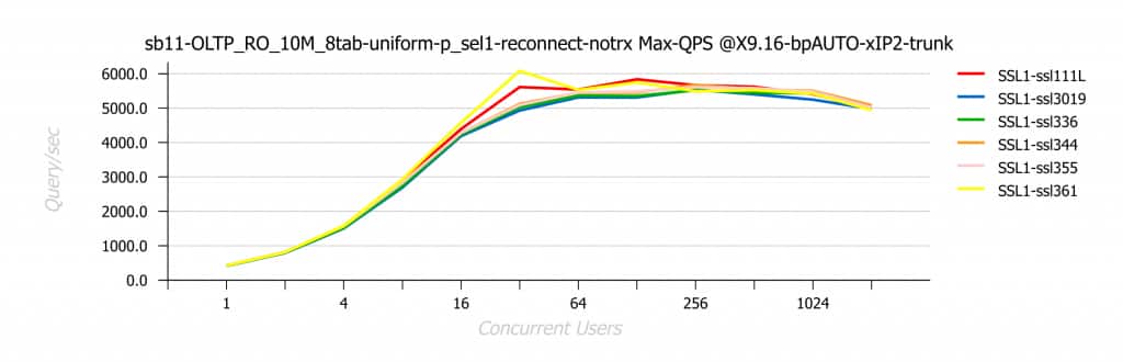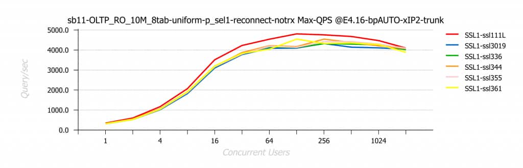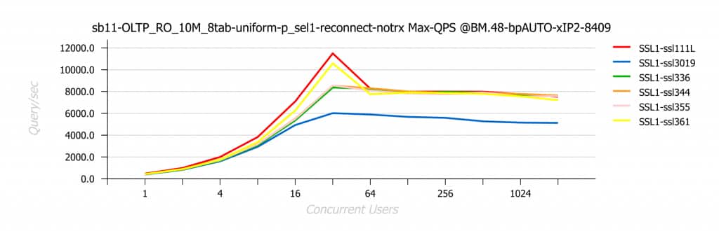 - Sysbench Re-Connect SELECTs: same workload as above, except after each SELECT query we’re reconnecting to MySQL Server to stress-test the TLS code and evaluate connection initiation overhead.