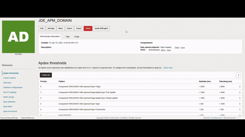 - In OCI, enable APM’s built-in enrichment rule for mapping JD Edwards codes to names or descriptions.