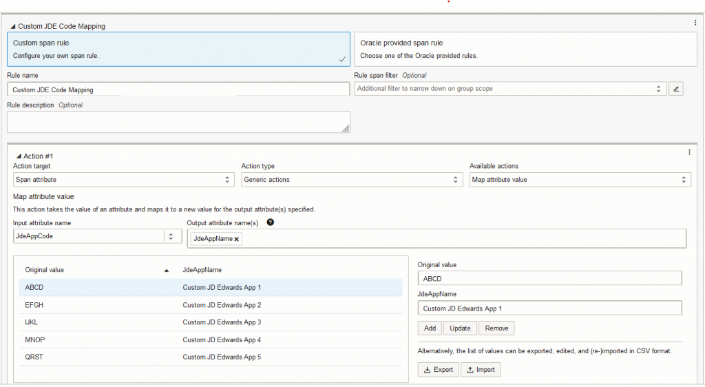 The enrichment rule in the newly created group will look for JD Edwards code attributes in spans specified by the filter. Then the code values will be translated into names assigned as values to new JD Edwards attributes using lookup tables included in the Oracle-provided rule.