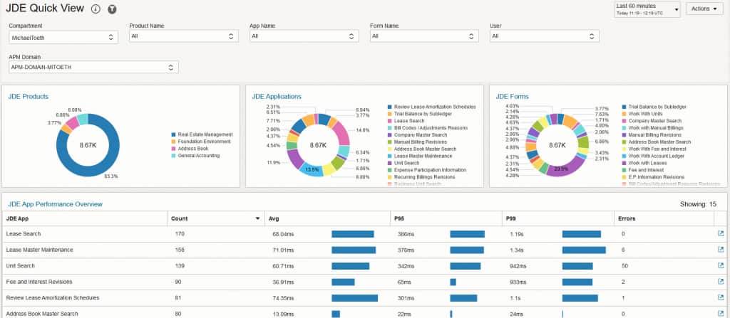 Instrument the Oracle JD Edwards suite with OCI Application Performance Monitoring (APM) to capture app, form, and error codes. Enrich application traces with this additional context to identify performance bottlenecks found in APM and their impact on critical business functions managed via JD Edwards.