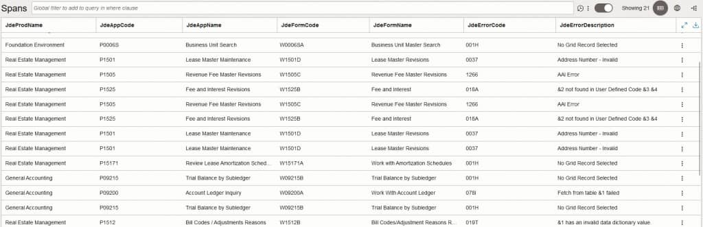 The out of the box span enrichment rule translates the JD Edwards codes of standard applications and forms. In case your JD Edwards includes custom applications and forms, you can add an additional custom rule to the JDE Enrichment Group which translates the codes of custom components into more descriptive names of your choice like shown below. Click here for more information about custom span enrichment rules.