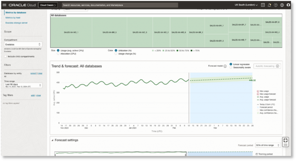 Ops Insights leverages AutoML to provide automated capacity planning. For architects, this is a critical capability for proactive scaling. For high-end platforms such as Exadata Cloud and Autonomous Database on Dedicated Infrastructure, Ops Insights can forecast compute, storage, and workload growth. This allows organizations to anticipate capacity shortfalls and performance risks before they occur, supporting data-driven infrastructure planning and cost optimization.