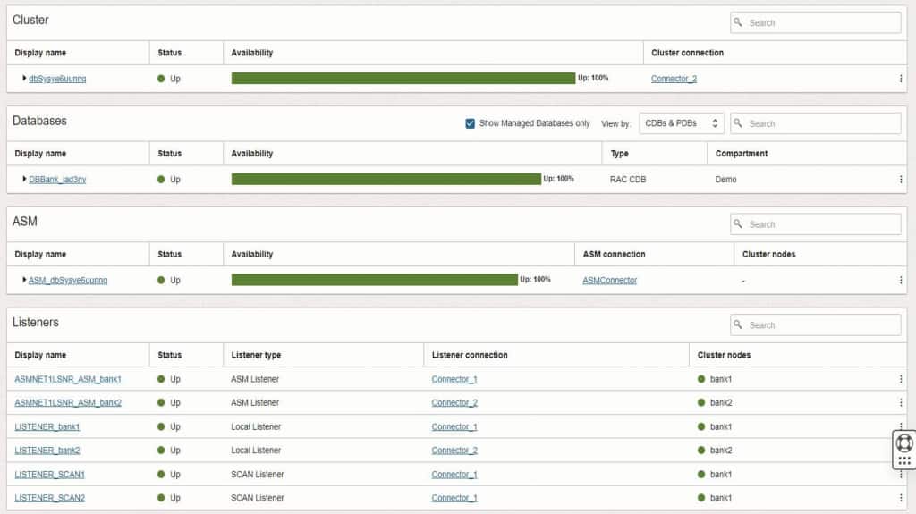 With Database Management, you can monitor key components that make up an Oracle database system as a cohesive unit, including clusters, databases, ASM, and listeners. For DBAs, this accelerates triaging complex issues by allowing a quick indication of whether an issue is rooted in database, cluster, ASM, or connectivity problems. For SRE teams, it supports service health views that align with how production platforms are operated end-to-end and answers questions, like: