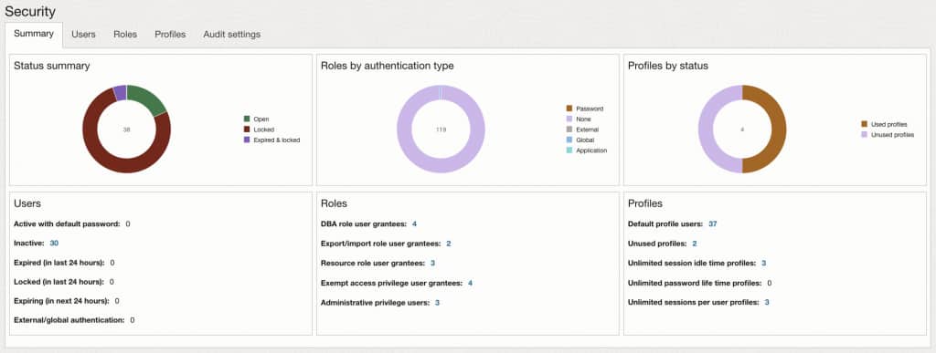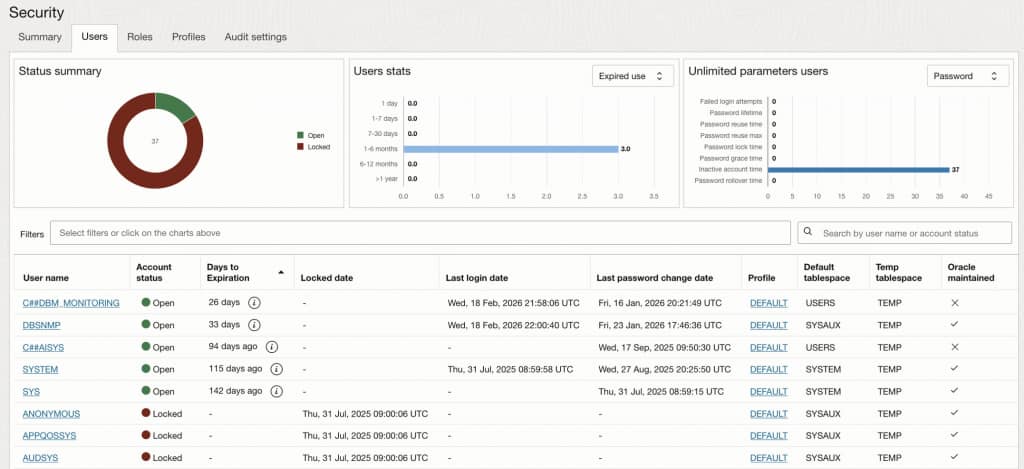 - Profiles: Profile usage and identification of profiles with “unlimited” password or resource parameters, with drill-down to full profile settings.