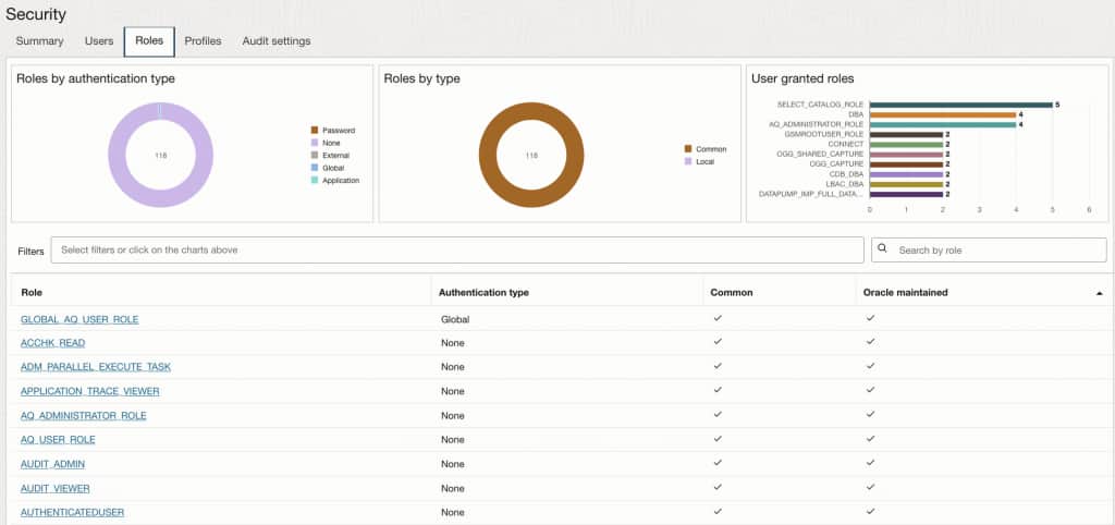 Performance and availability are only part of operating successfully in the cloud and multicloud – security posture needs continuous visibility as well. Database Management’s new Security features help you monitor key security controls for Oracle databases. The feature extends the existing Users monitoring console, previously focused on account-level visibility, to include profile enforcement, privilege analysis, and audit configuration status.