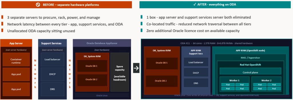 Most ODA environments today run application workloads on separate servers, connected to the database over a network. Every application-to-database call crosses that network. OpenShift on ODA changes this by deploying containerized applications in a dedicated ODA Application KVM (App KVM) on the same physical appliance as the database, reducing network traversal between tiers and consolidating what were previously separate procurement and operational responsibilities onto a single validated platform.